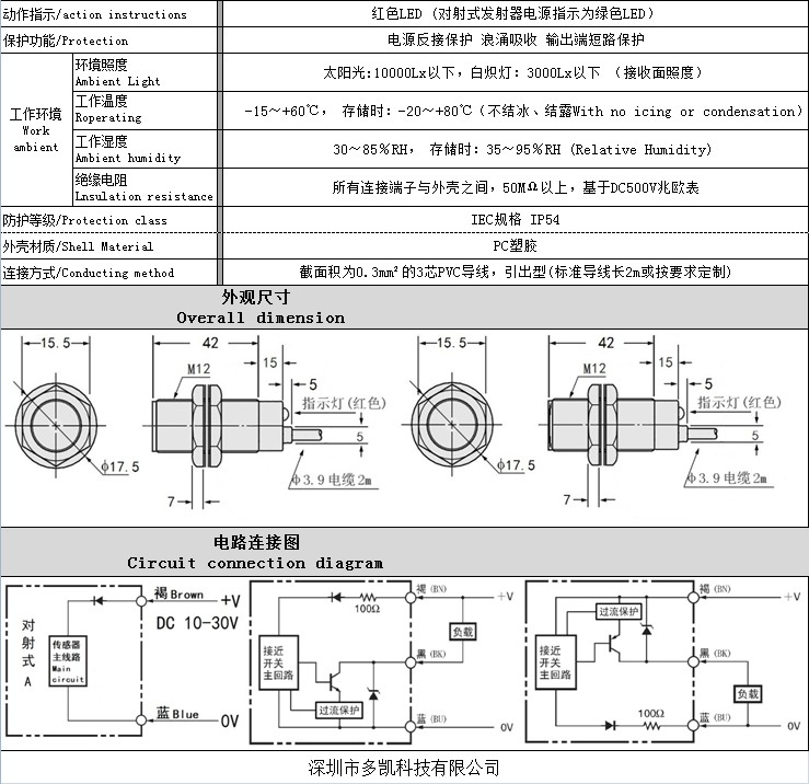 紅色LED (對(duì)射式發(fā)射器電源指示為綠色LED) |